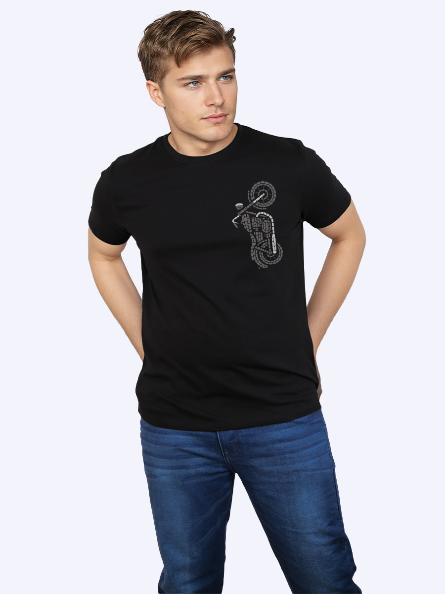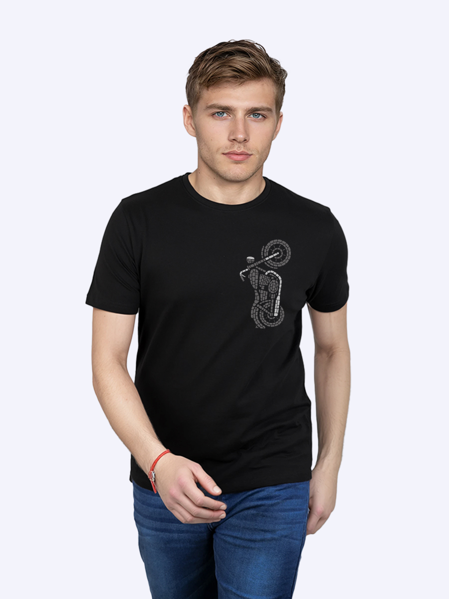 This bold black t-shirt features a sleek mosaic-style biker doing a wheelie, blending urban edge with artistic flair for modern streetwear enthusiasts.
