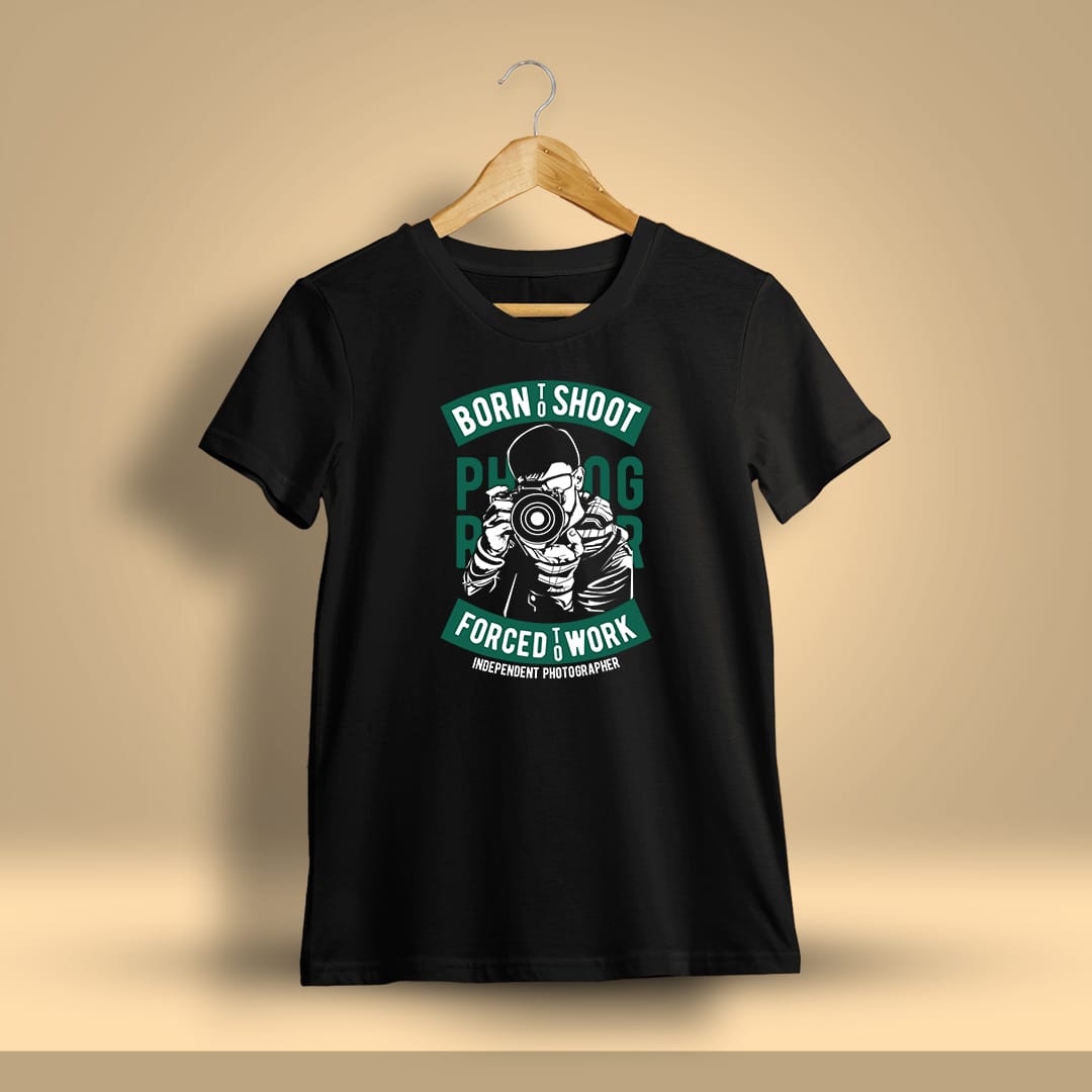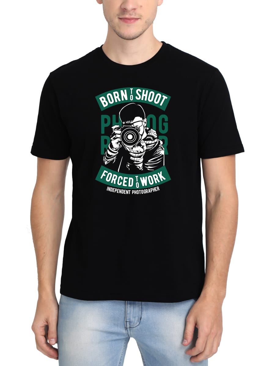 Born To Shoot Forced To Work Photography T-Shirt celebrates passion for photography with a bold design, perfect for enthusiasts balancing work and creativity.