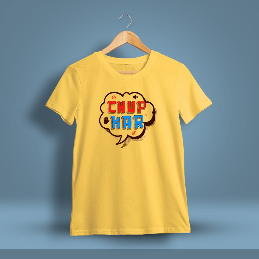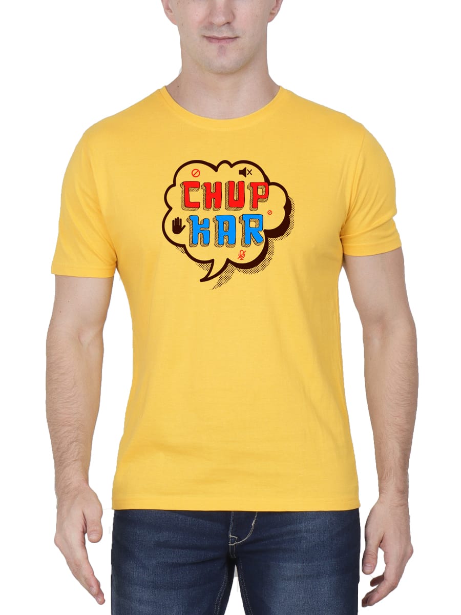 Chup Kar Fun Printed T-Shirt adds humor to your style with a bold statement. Comfortable and trendy, it’s perfect for those who love a fun, witty vibe.