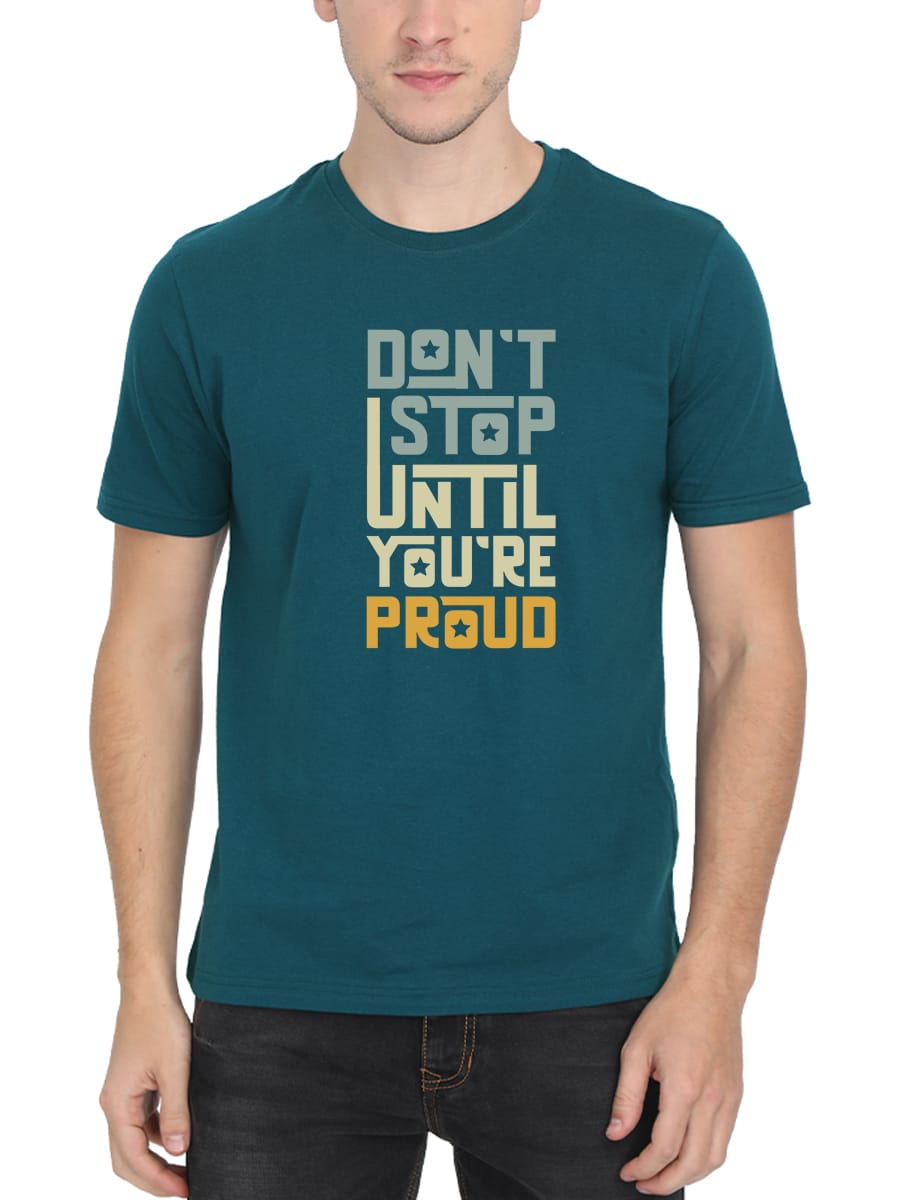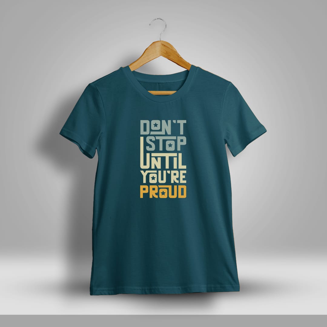 This motivational t-shirt features the empowering phrase “Don’t Stop Until You’re Proud,” inspiring perseverance, determination, and self-belief—perfect for anyone chasing goals and personal growth.