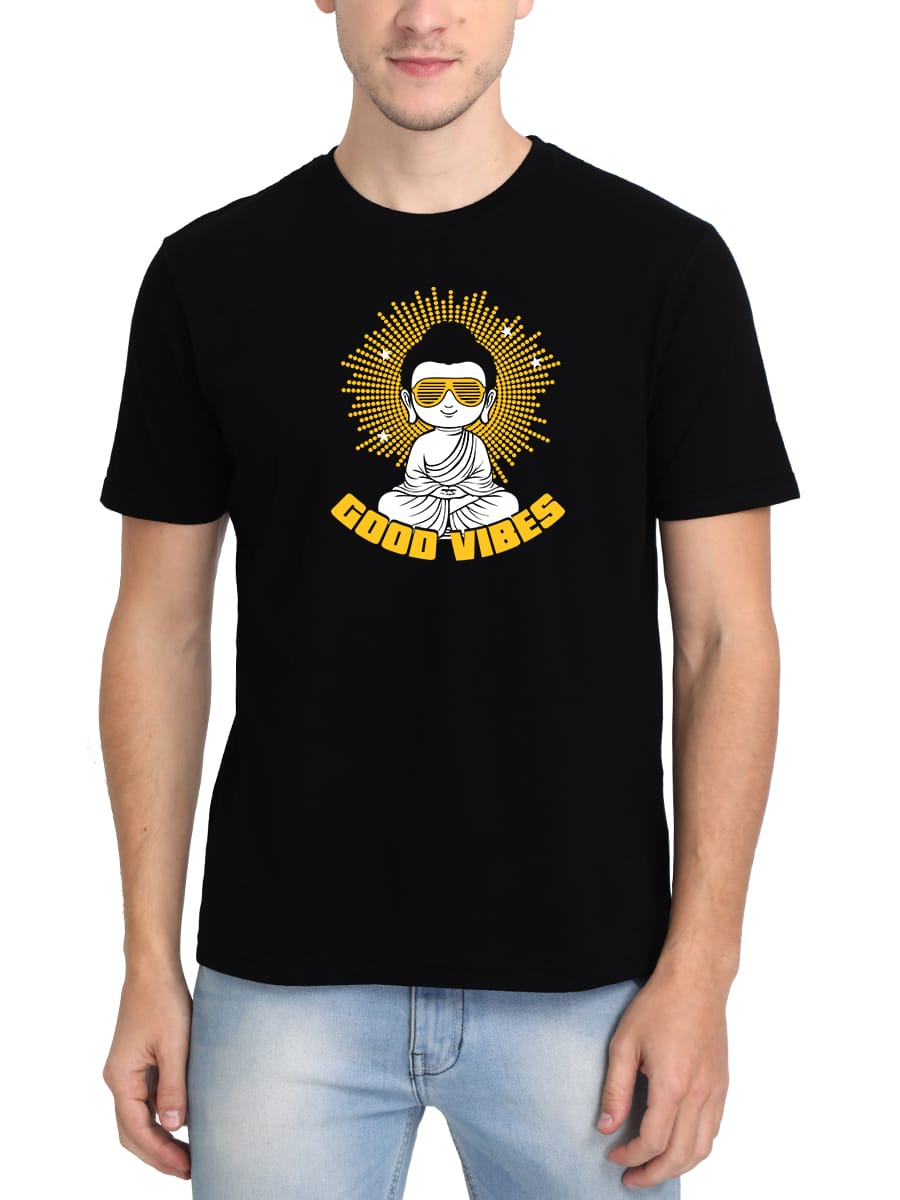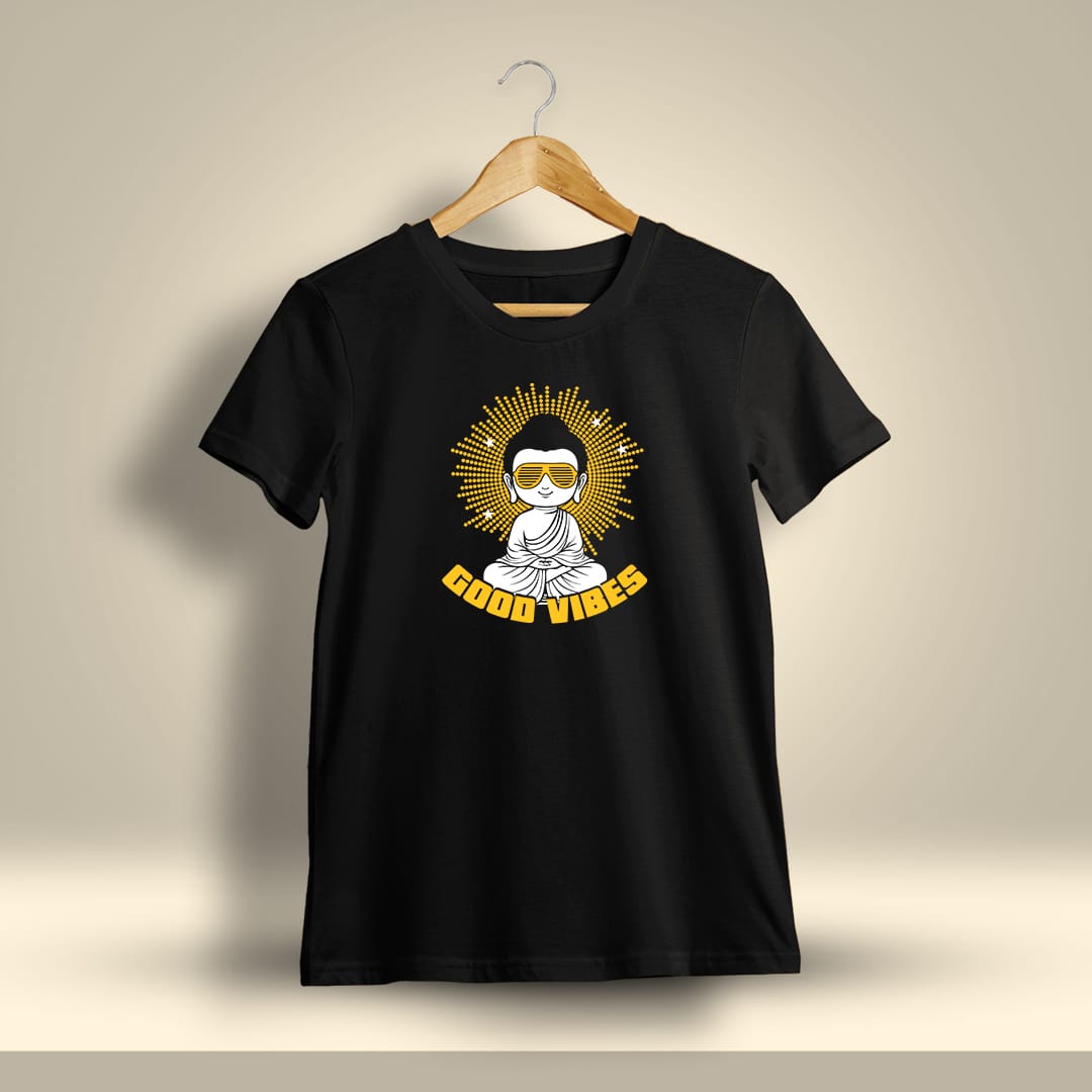 The Good Vibes Buddha Graphic T-Shirt features a serene Buddha design radiating positivity, crafted on soft, breathable fabric for comfort and mindful style.