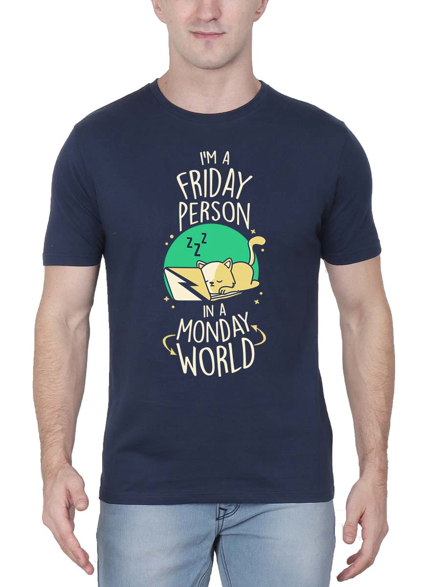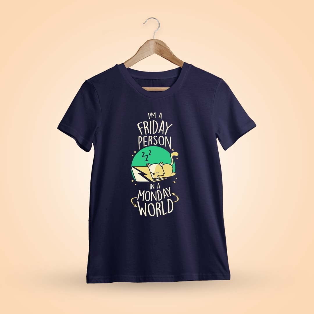 Stand out with our “I’m A Friday Person In A Monday World” T-shirt. Perfect for those who bring weekend vibes to the workweek grind.