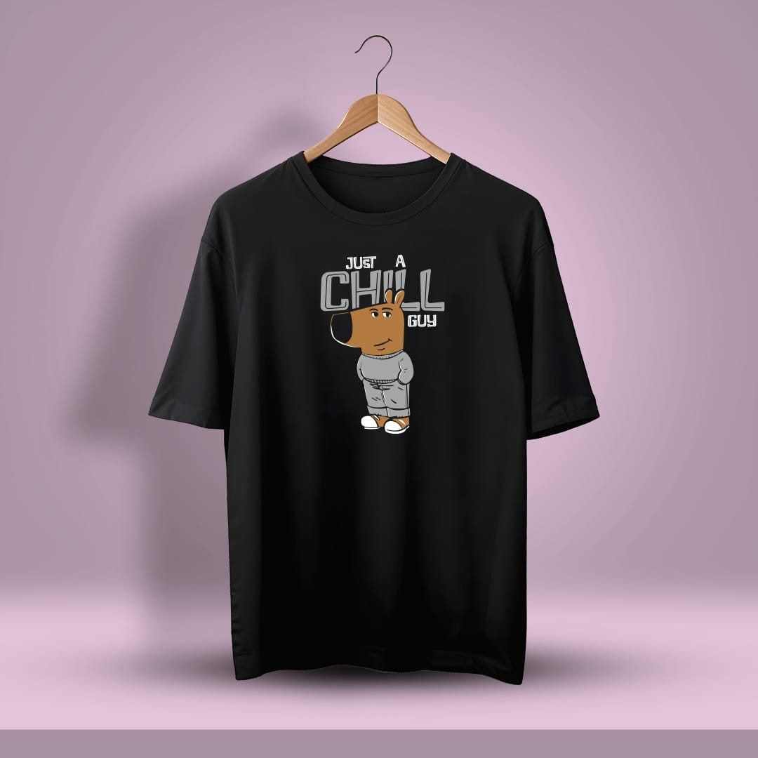 Elevate your casual style with the Just A Chill Guy Black Oversized T-Shirt. Roomy fit, soft fabric, and bold print for maximum comfort and chill vibes.