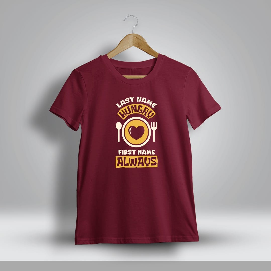 The “Last Name Hungry First Name Always” Printed T-shirt is a fun and quirky way to express your love for food. Perfect for casual outings and foodie vibes.