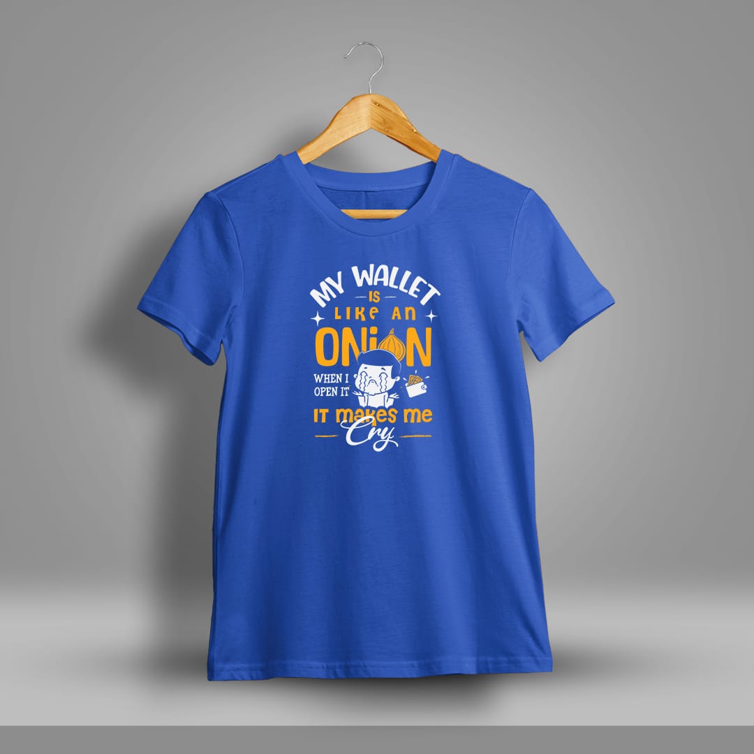 Get laughs with this My Wallet Is Like An Onion Fun Printed T-Shirt, humorously showcasing how spending money can bring tears, just like cutting an onion.