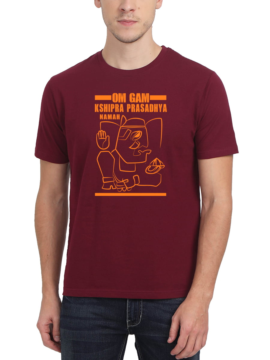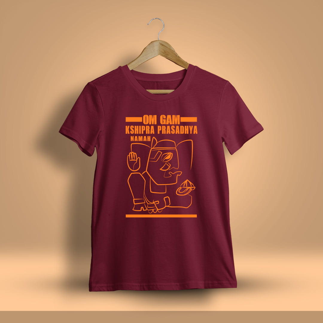Om Gam Kshipra Prasadhya Namah Ganesh T-Shirt showcases a spiritual design with a revered mantra, combining tradition and comfort for everyday wear and special occasions.