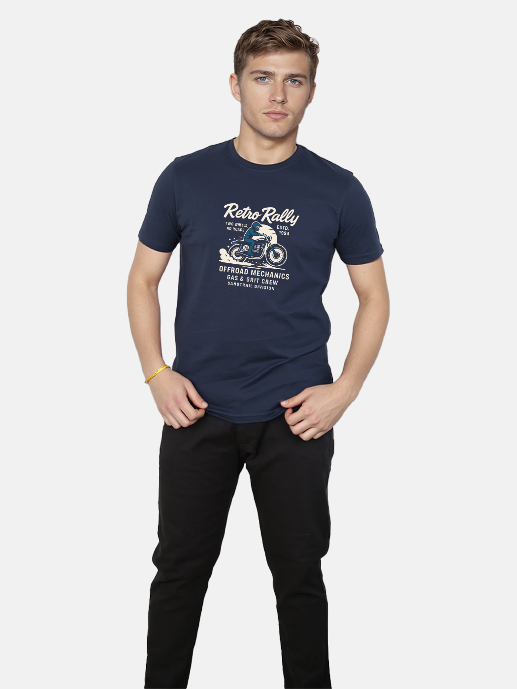 Retro Rally Printed T-Shirt for men with half sleeves. Perfect blend of comfort and casual style. Ideal for everyday wear, parties, or gifting.