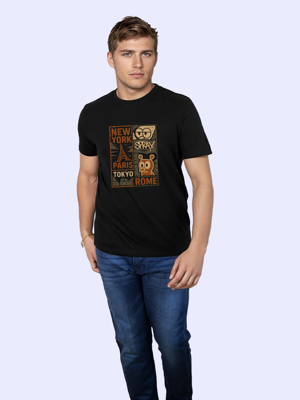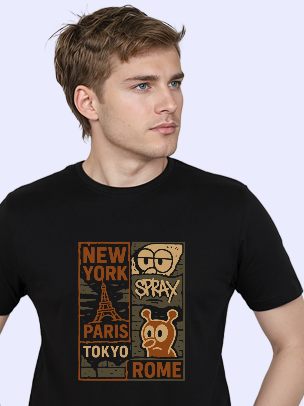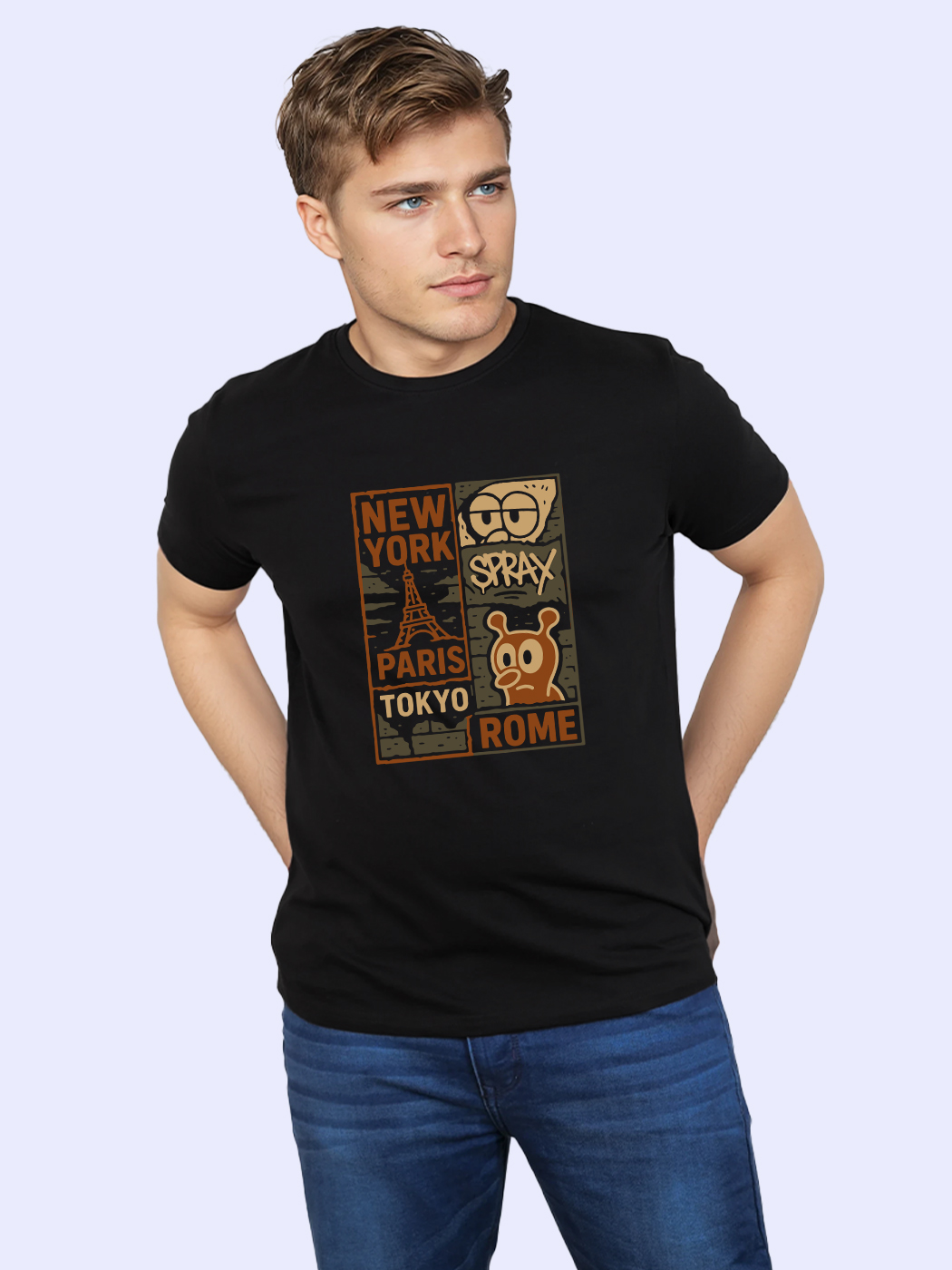 Urban travel-style half sleeve T-shirt for men, blending city vibes with adventurous spirit.