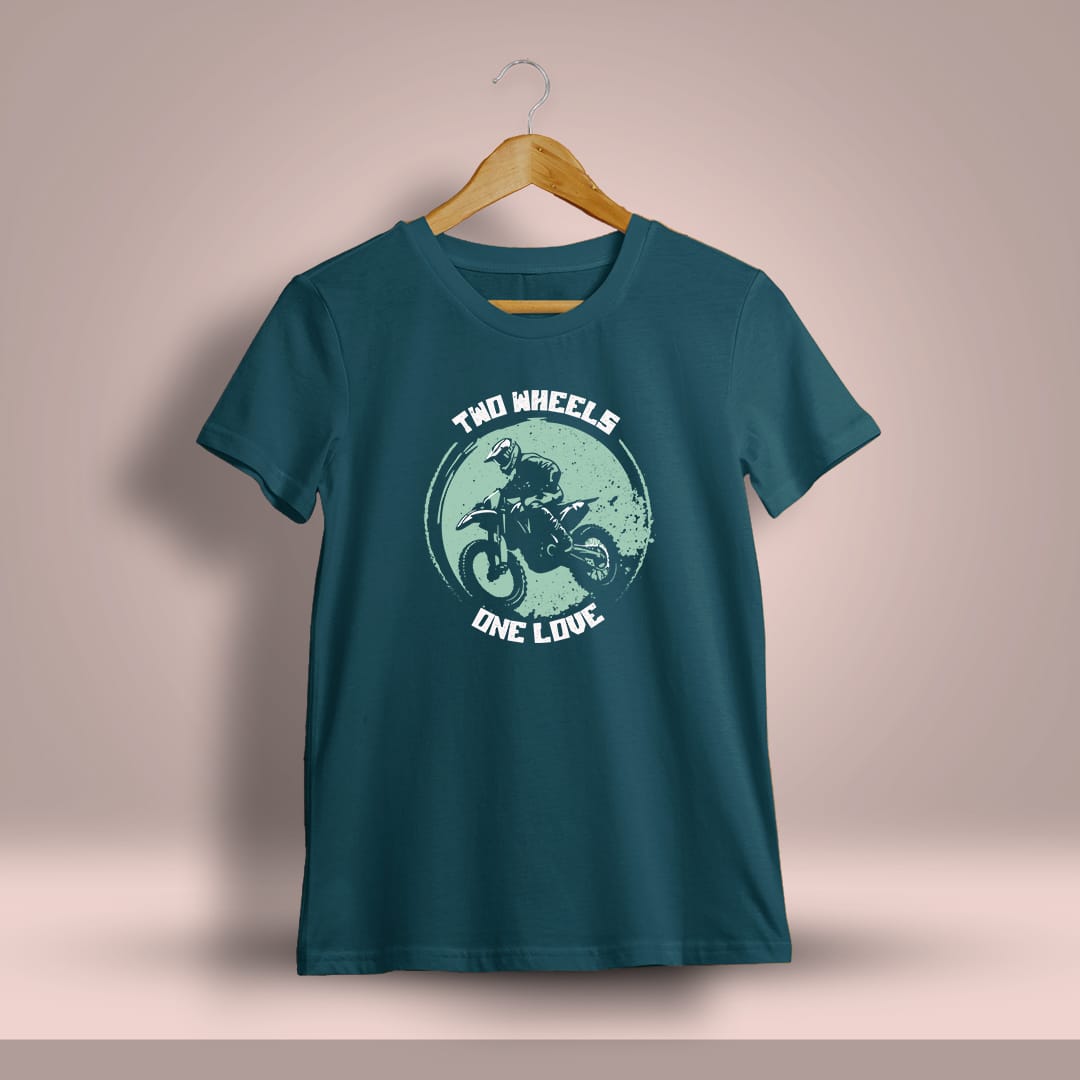 Two Wheels One Love Bike Printed T-Shirt is perfect for bikers, showcasing a bold design that reflects the deep connection between riders and their machines.