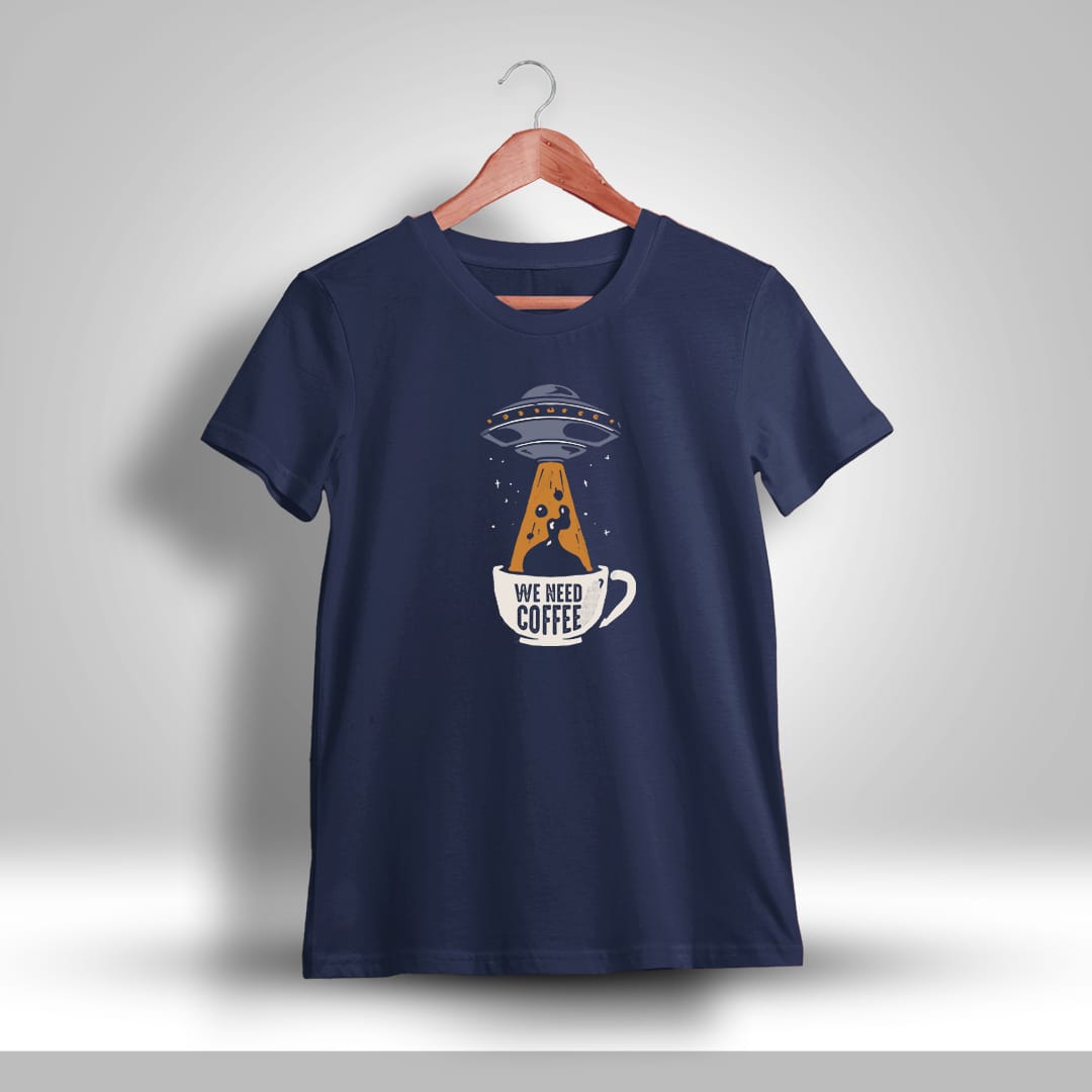 We Need Coffee – UFO Printed T-Shirt is a fun blend of caffeine obsession and sci-fi humor. Soft, breathable, and a must-have for coffee lovers who need their daily fix.