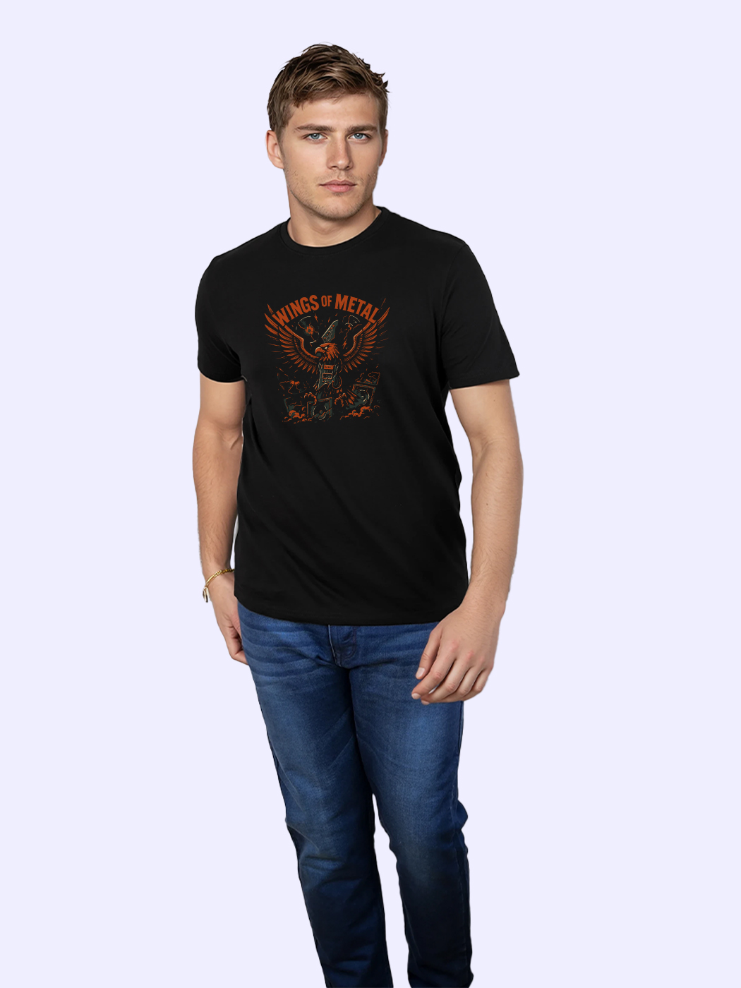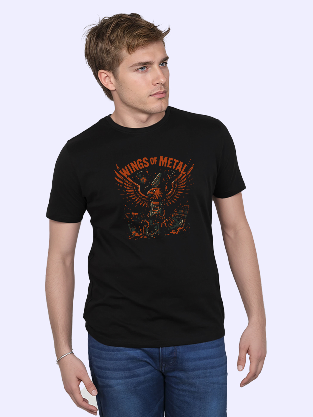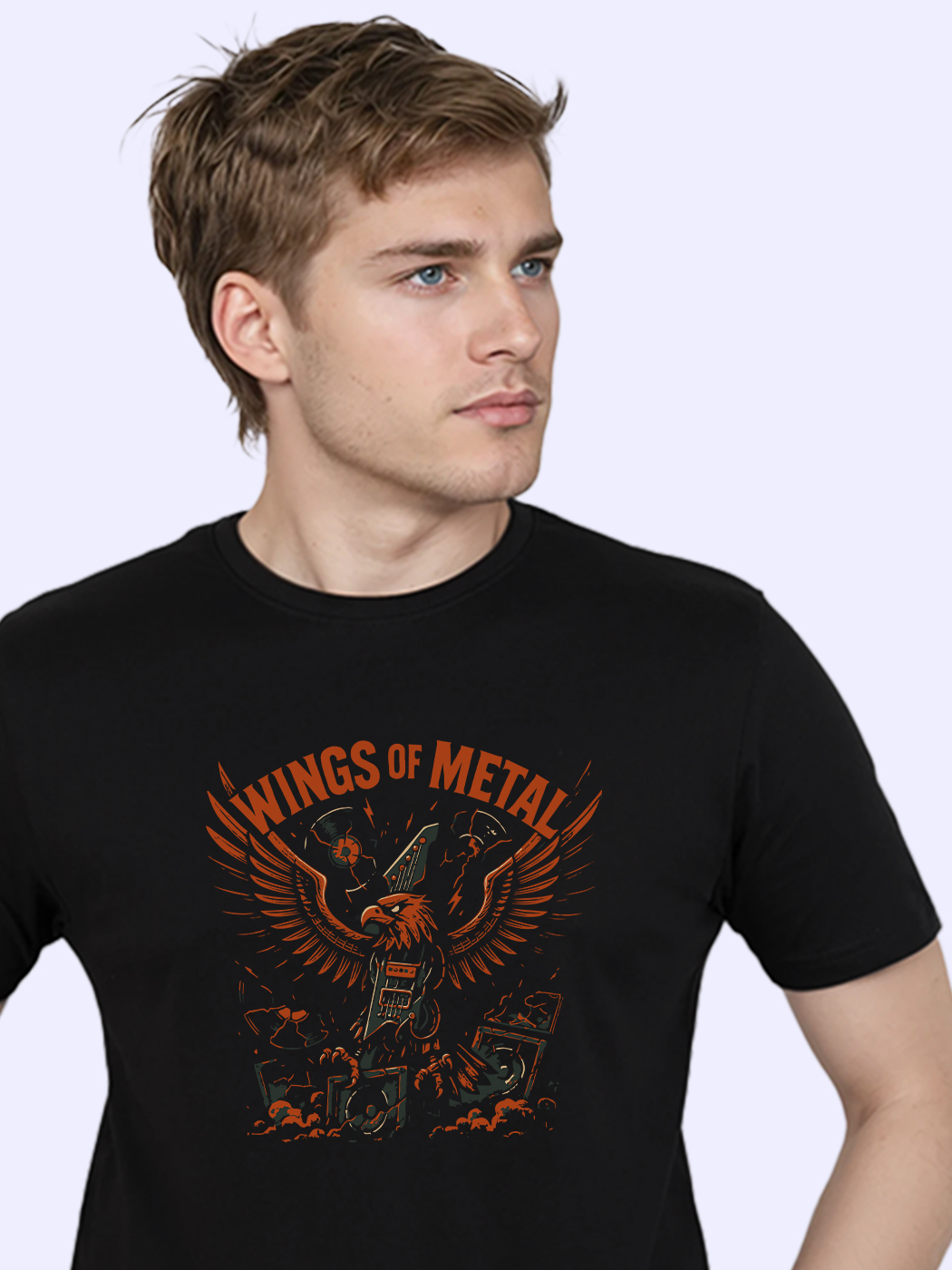 Wings of metal tee celebrates hardcore music culture. A bold half sleeve for men who love headbanging, metal vibes, and powerful self-expression.